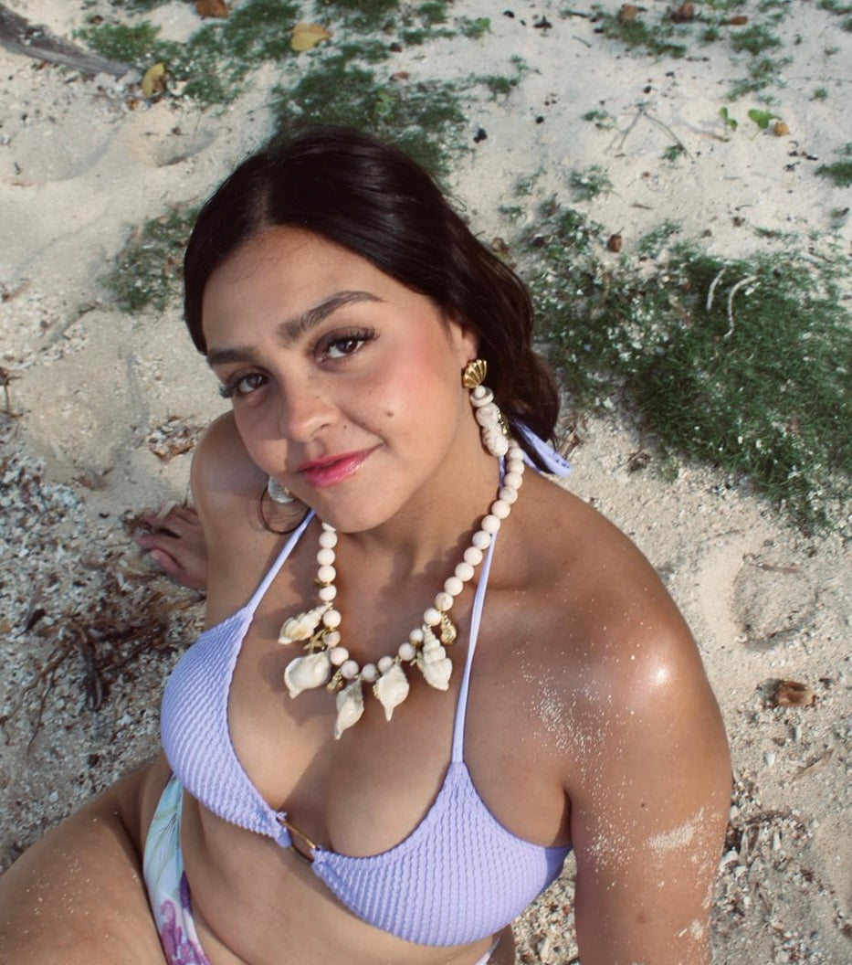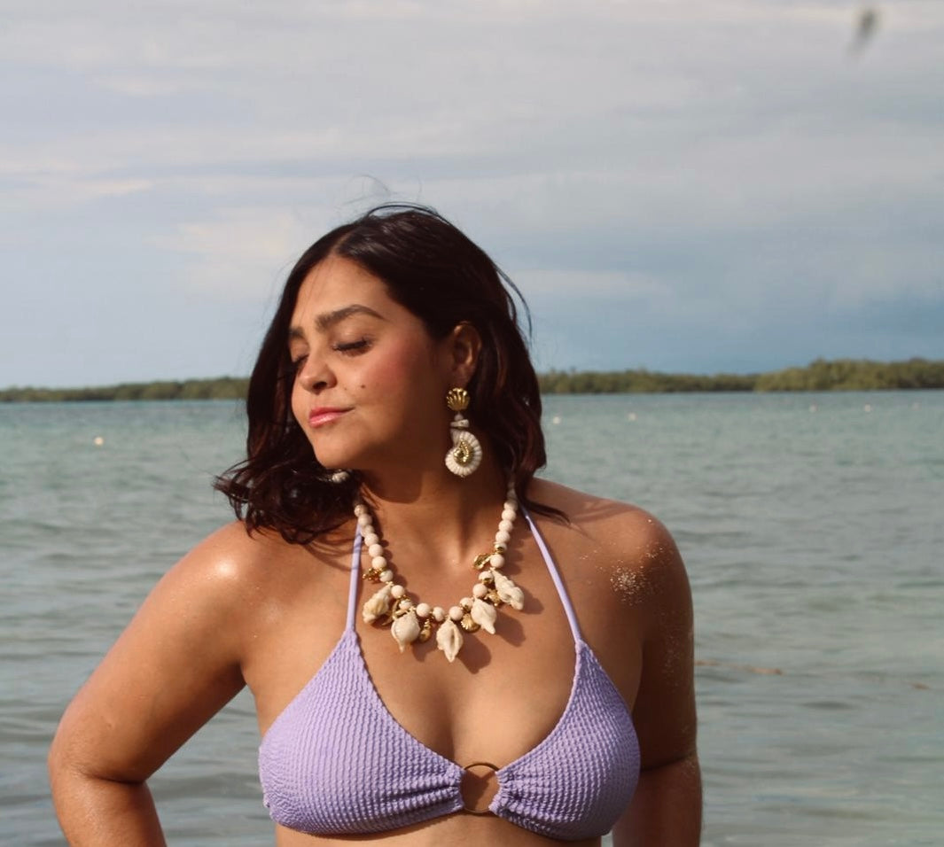 Es un set de collar y pantalla que evoca la inmensidad del Caribe y la serenidad del amanecer! Cada detalle fue pensado para moverse contigo, recordándote la fluidez del agua y la fuerza de tu esencia! Un abrazo del mar y el sol, diseñado para acompañarte con calma y elegancia!